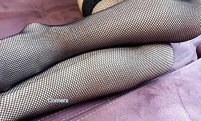 Solo brunette babe dressed in fishnet stockings pleasuring herself