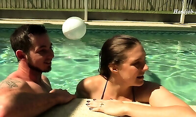 沙头发的青少年尤物凯蒂吻吸和磅的游泳池户外活动