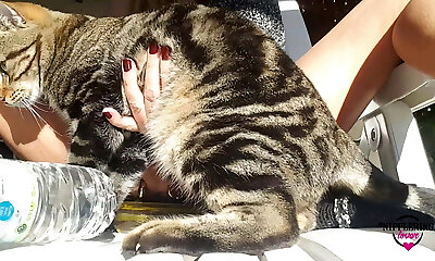 Chubby teen with long dark hair playing with her puss on her bed