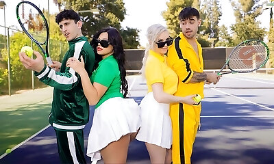 две огромные лесбийские цыпочки позволяют худощавому мужчине помочь им
